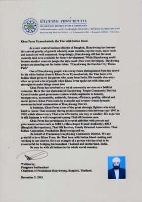 "วันนี้ไทยได้ดุลการค้ากับอินเดีย การค้าระหว่างเราสองประเทศโตขึ้นเรื่อยๆ ทว่าเมื่อเทียบกับหลายประเทศที่ทำการค้ากับประเทศอินเดียแล้วนั้นประเทศไทยยังอยู่อีกห่างไกลแต่สิ่งนี้ไม่ใช่ปัญหา กลับกันเป็นสิ่งท้าทายทำให้เราต้องทำงานให้หนักกว่าที่เป็นมา ปํญหาไม่ได้อยู่ที่สินค้าหรือราคา แต่อยู่ที่ต้องทำให้คนทั้งสองประเทศเข้าใจกัน เชื่อใจกัน ผมมั่นใจว่าคุณพ่อเปรม เดินมาถูกทาง เมื่อใดเศษรฐกิจไทยและอินเดียจับมือกันอย่างแน่นแฟ้นมากว่าทุกวันนี้ เราจะเห็นความเปลี่ยนแปลงด้านการค้าและการเมืองของสองประเทศในระดับมหภาคในรูปแบบที่ไม่เคยมีมาก่อน"